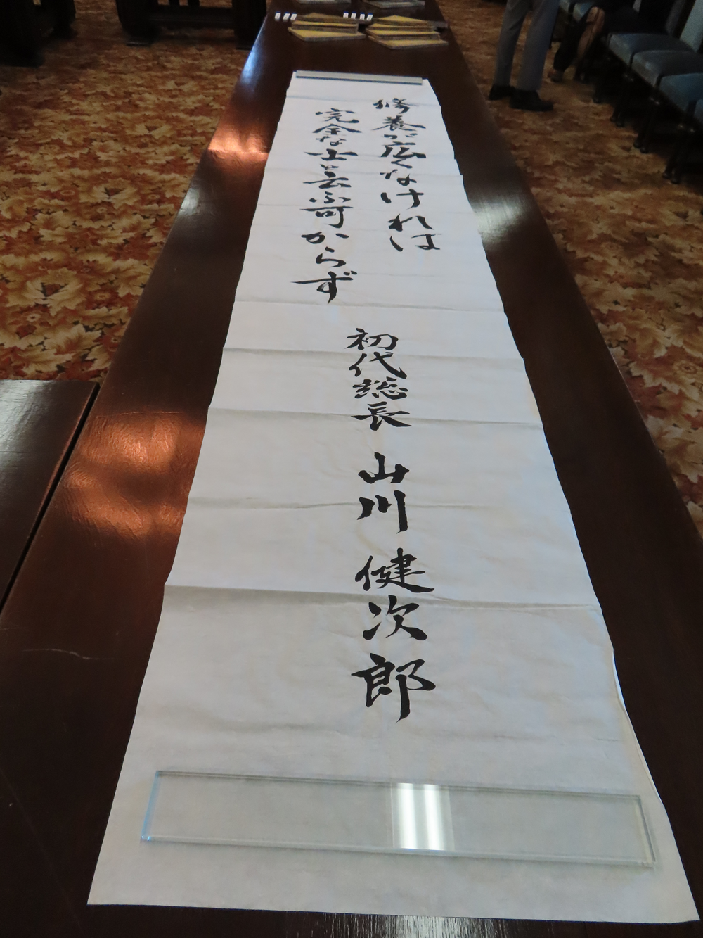 午前中に伊都キャンパスにて山川総長の胸像、歴代総長肖像画、九州大学の歴史(常設展)などを見学され、午後から箱崎サテライト旧工学部本館4階会議室にて、大学文書館所蔵の山川健次郎資料について藤岡健太郎教授の説明が行われました。